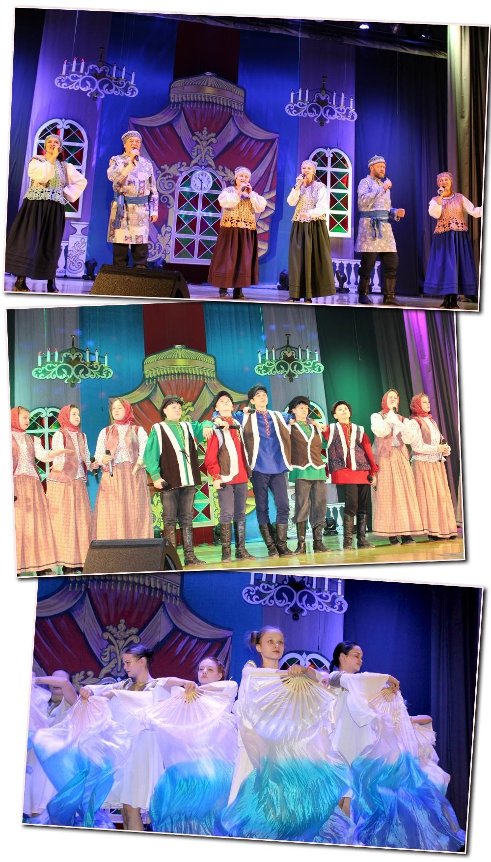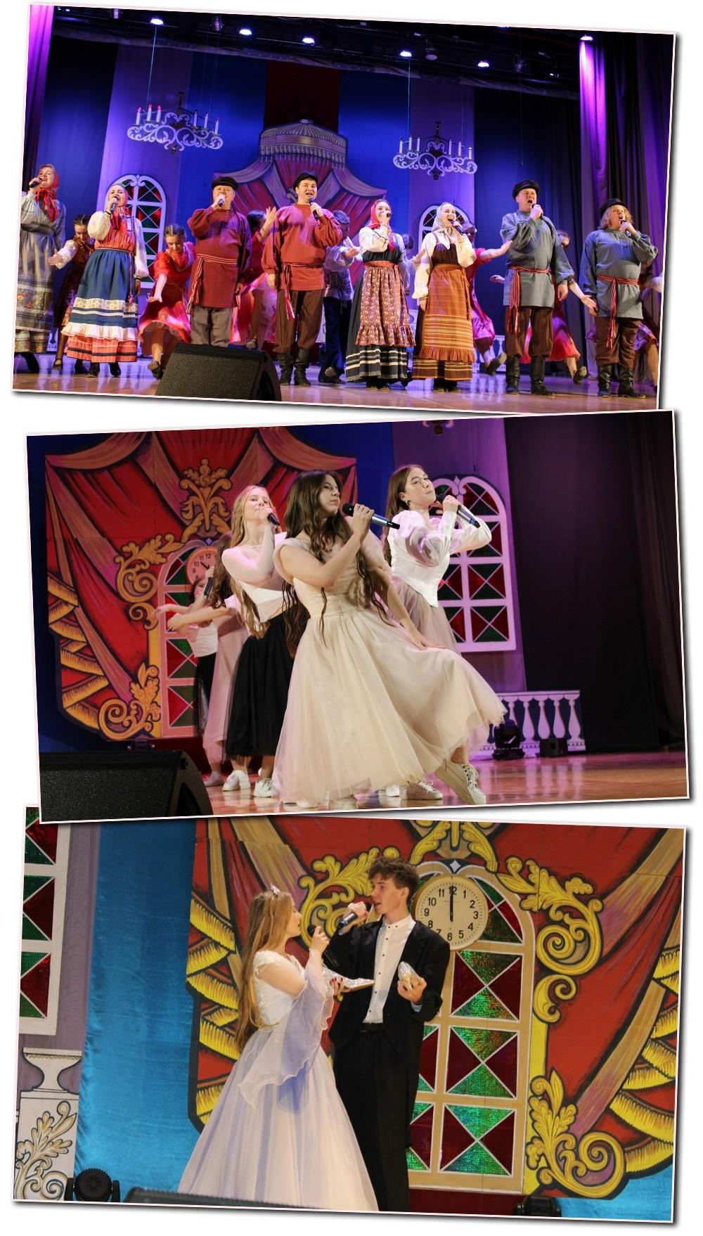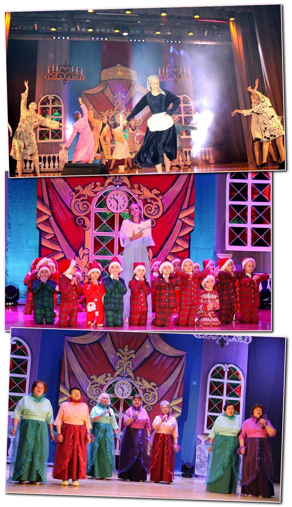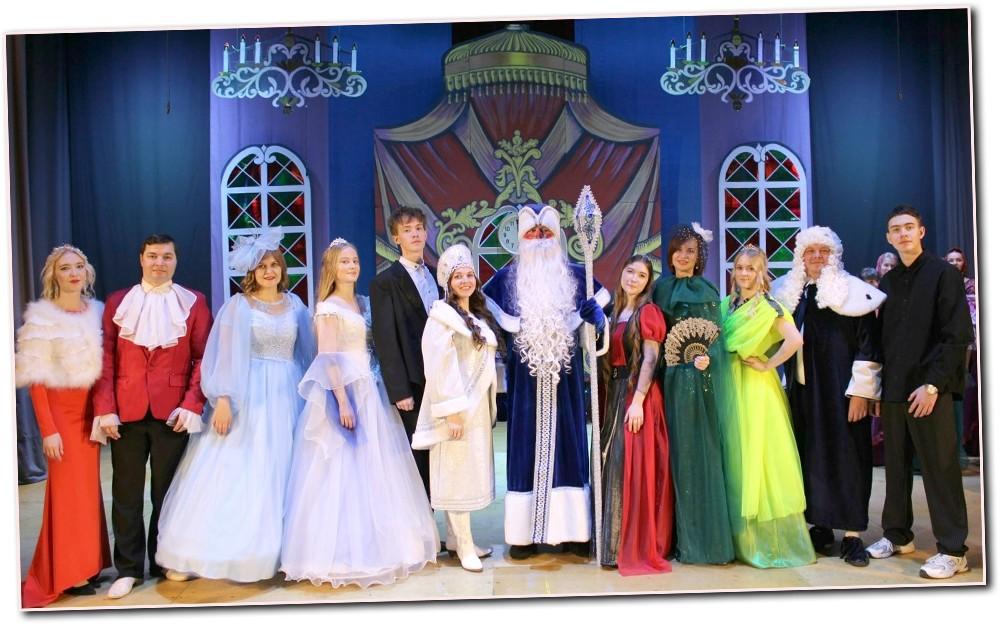 А на сцене районного Дома народного творчества происходило прекрасное, удивительное и сказочное действо. Бесподобное начало театрализованного концерта – появление Деда Мороза со Снегурочкой и Золушки с песней «Хоть поверьте, хоть проверьте…» И закрутилась череда ярких музыкальных номеров. Зрители наслаждались игрой персонажей сказки с оттенком современной жизни и разнообразием выступлений – от зажигательных танцев до мини-сцен и трогательных вокальных номеров. На протяжении почти двух часов артисты, солисты и творческие коллективы дарили зрителям свои неповторимые и уникальные музыкальные подарки. Красочные и запоминающие номера, а также яркие и нарядные костюмы подарили незабываемые впечатления и эмоции зрителям и создали новогоднее настроение. Каждый артист, каждый коллектив подарил частичку своего тепла, таланта и настроения, стал настоящим праздником для зрителей. Как проникновенно исполнена Марией Ольковой песня «Лёд»… Нет слов! Всегда восхищает «Хит-парад» (руководитель Екатерина Владимировна Лобанова). В этот раз они профессионально, кокетливо и игриво исполнили песню «Мой ненаглядный». А как хороши наши образцовые танцевальные коллективы – «Анютины глазки» (руководитель Анна Владимировна Васильева) и ансамбль «Овация» (руководитель Анастасия Александровна Бердникова). Радует исполнение народных песен ансамблей «Заплетися, плетень» (руководитель Марина Юрьевна Олькова), «Русский стиль», «С песней по жизни» – руководитель Марина Николаевна Лобанова. Мужчины-солисты Андрей Куршаков и Павел Шулепов неизменно всегда на высоте. Коллектив РДНТ постарался на славу! Как же восхитительно были сыграны роли актерским составом! Мачеха – Анна Владимировна Васильева, Золушка – Карина Богомолова, 1 Дочь – Анна Милютина, 2 Дочь – Арина Кузнецова, Церемониймейстер – Александр Александрович Лобанова, Фрейлина – Алёна Алексеевна Вахрушева, Король – Алексей Александрович Чезганов, Принц – Тимофей Кропачев, Фотограф – Андрей Посаженников, Фея Крёстная – Надежда Сергеевна Перетягина.
