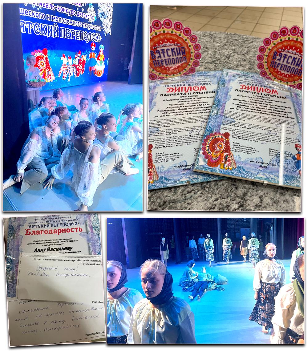 14 февраля коллектив побывал на Всероссийском фестивале-конкурсе детского, юношеского и молодежного творчества «Вятский переполох» и стал победителем в номинациях: • Народный стилизованный танец, Смешанная (старшая и средняя группа) Лауреаты 1 степени; • Эстрадный танец, 10-13 лет (средняя группа) Лауреаты 2 степени. В конкурсе было более 100 номеров! Мы поздравляем ансамбль «Анютины глазки» и желаем им дальнейших побед!!!